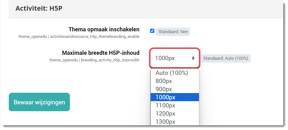Verbeterde H5P-integratie: H5P is een van de favoriete activiteiten onder onze klanten. Soms wordt een H5P-element automatisch te groot weergegeven, waardoor een stuk informatie aan de onderkant niet volledig zichtbaar is. Met het OpenEdu-thema kun je nu met één klik een vaste breedte instellen voor alle H5P-activiteiten.